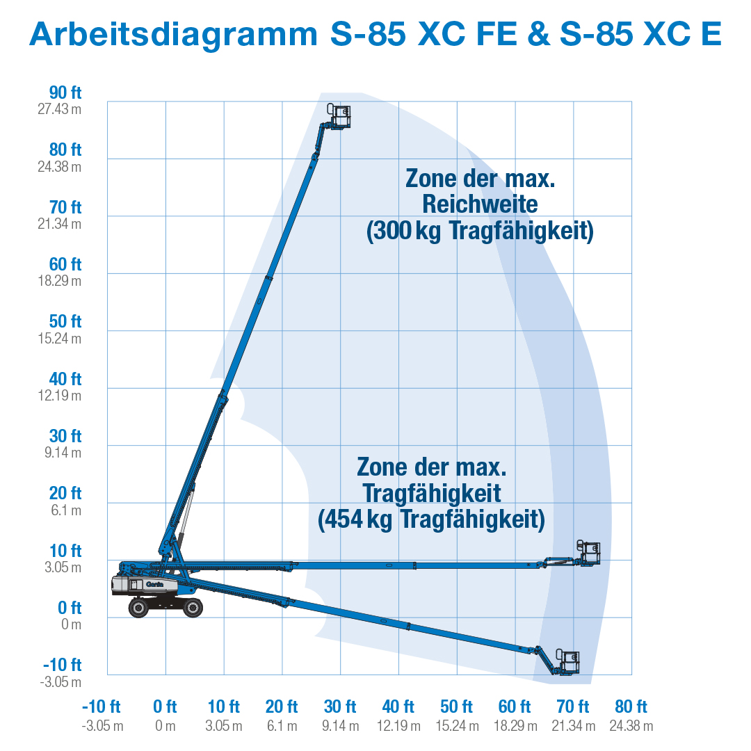 Die Genie S®-85 XC™ E ist eine vollelektrische Teleskoparbeitsbühne in der Xtra Capacity™ (XC) Ausführung für zusätzliche Tragfähigkeit. Sie liefert dieselbe Leistung wie eine dieselbetriebene Maschine, eröffnet jedoch neue Einsatzbereiche, wenn ein geräuscharmer und/oder emissionsfreier Betrieb gefordert ist. Bei der XC-Ausführung ist die Plattform für bis zu drei Personen inklusive Werkzeug und Montagematerial ausgelegt.