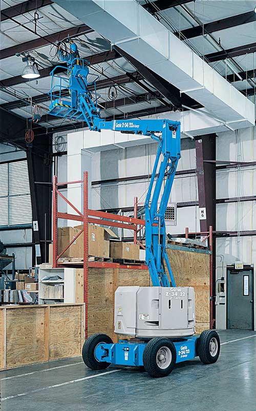 The Genie® Z®-34/22 electric articulating boom lift offers quiet, emission-free operation in the most sensitive work environments. It’s a 48V DC machine with a diesel-powered generator acting as a 100 amp battery charger, making it ideal for indoor and outdoor applications.