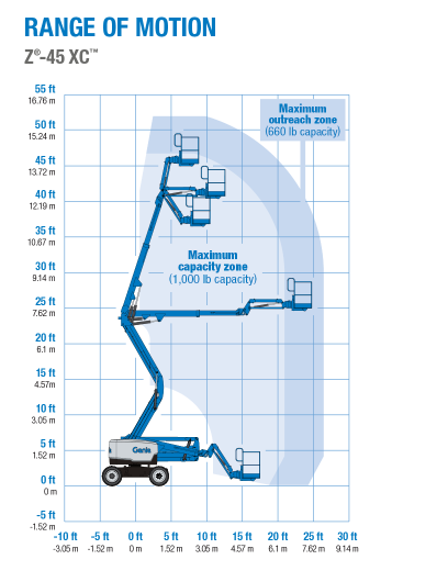 The Genie® Z®-45 XC™ articulating boom is the redesigned Xtra Capacity™ version of the popular rough-terrain Genie Z-45/25 J RT diesel powered articulating boom. It’s the first Genie XC articulating boom model, boasting the benefits of a dual-envelope design to provide an unrestricted platform capacity of 660 lb (300 kg) and a restricted capacity of 1,000 lb (454 kg).