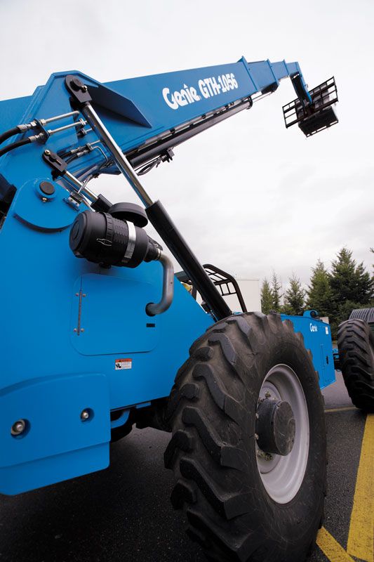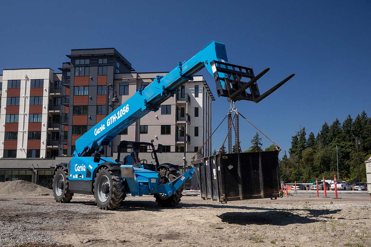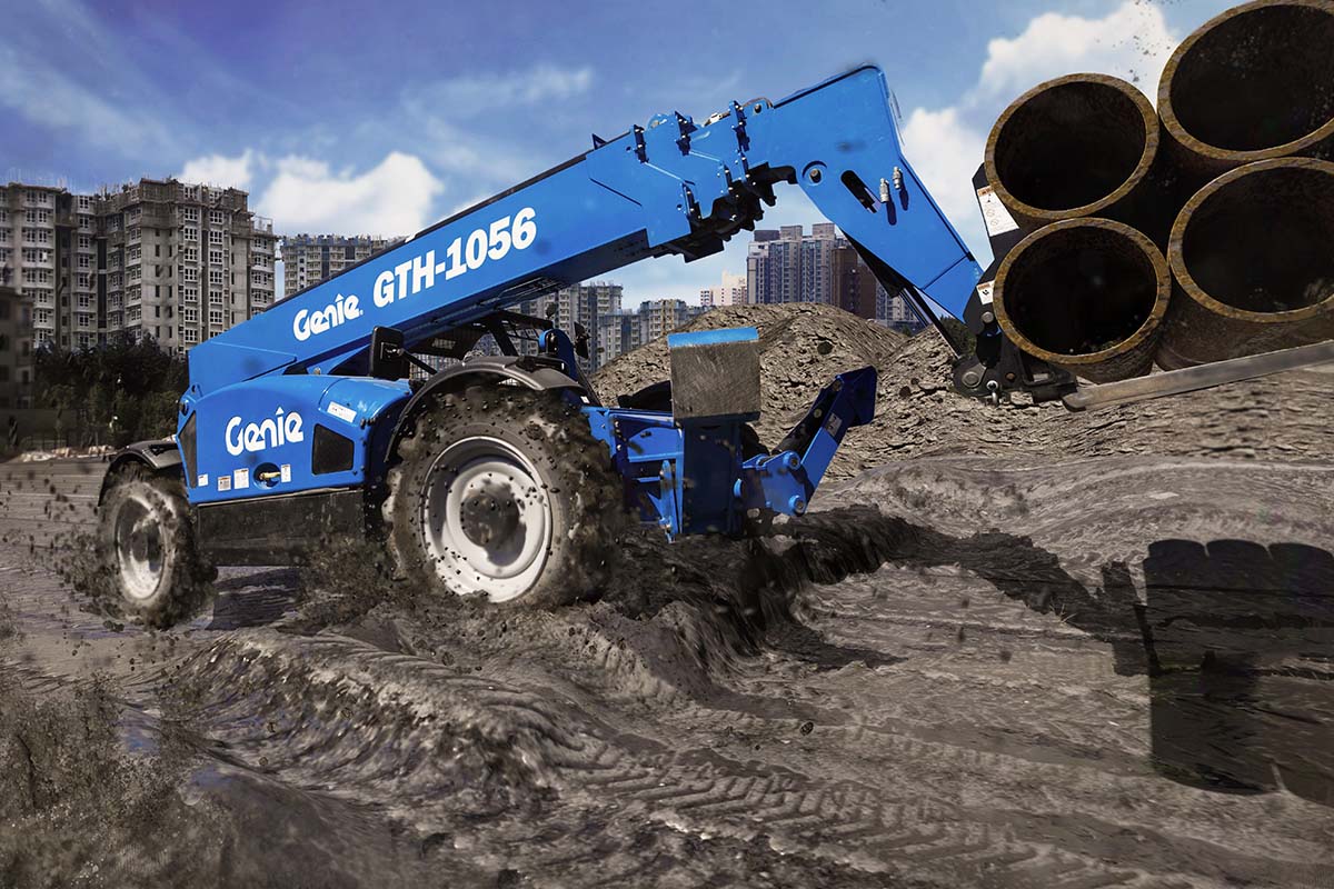 The Genie® GTH™-1056 telehandler offers excellent lift capacity and a maximum forward reach 42 ft (12.8 m) to move heavy loads over obstacles. Powerful four-wheel drive and turbocharged diesel engine to handle even the toughest worksite conditions.