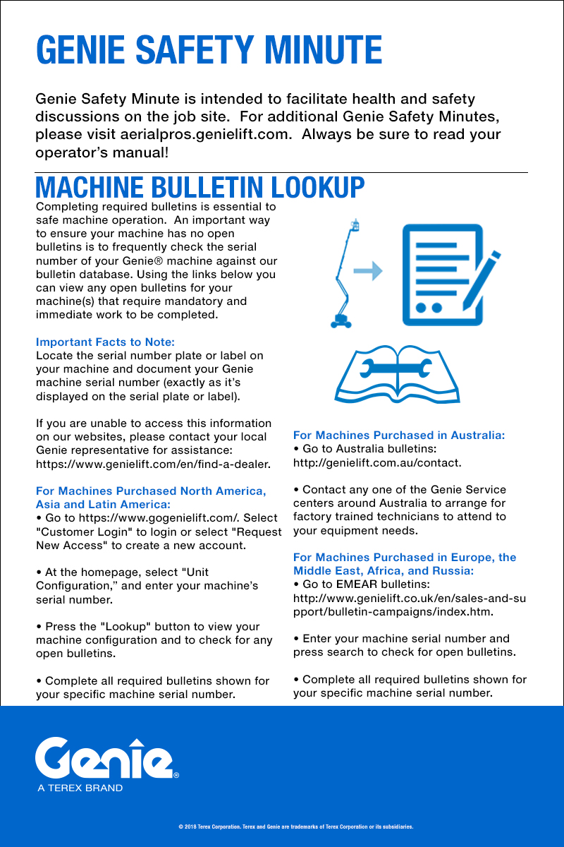 Safety of product users is of paramount importance to Genie. Various bulletins are used by Genie to communicate important safety and product information to dealers and machine owners.