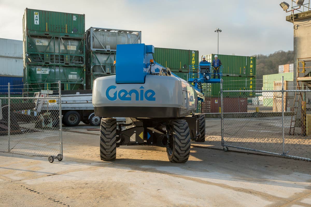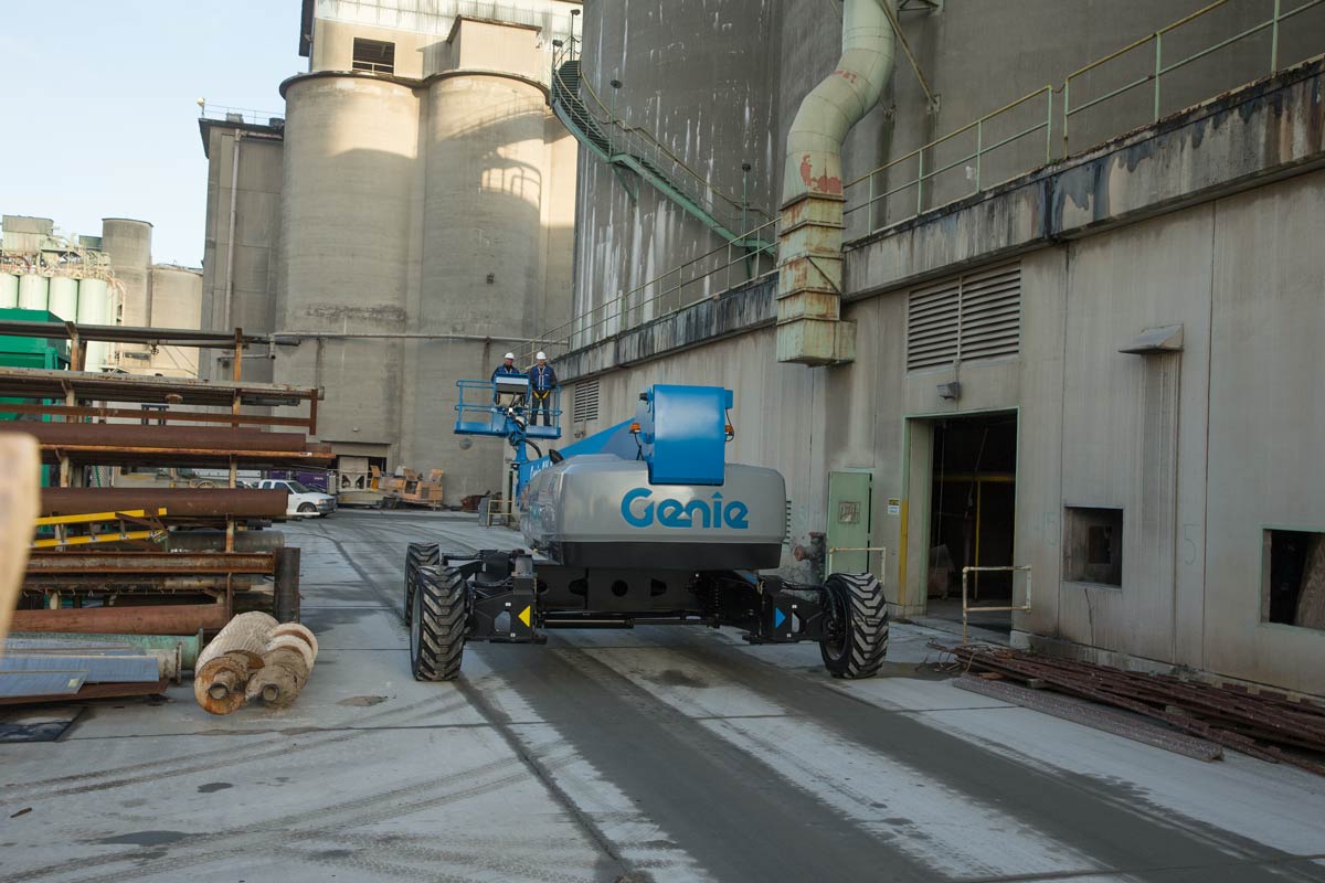 • El sistema Genie X-Chassis® se extiende y retrae para proporcionar estabilidad durante el trabajo y un perfil estrecho para el transporte